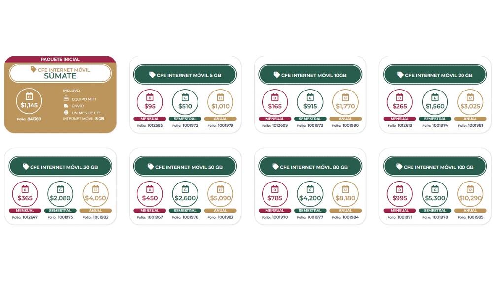 - CFE Internet Móvil 100GB: desde $995 hasta $10,290