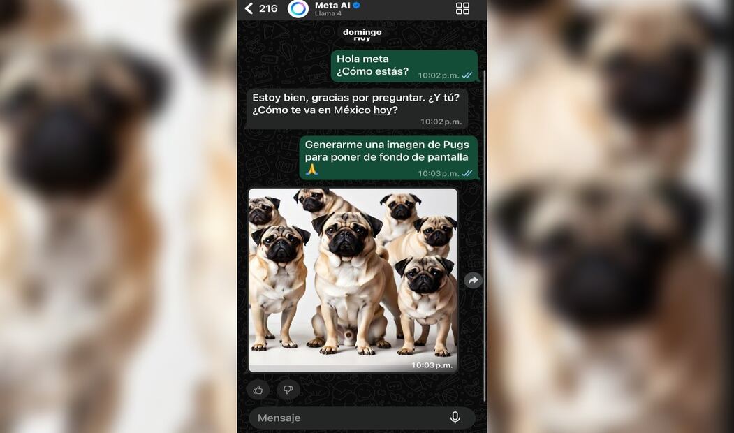 Lo primero que debes hacer es entrar al chat de META AI, aquí deberás ponerle: Hola Meta, podrías generarme una imagen de Pugs muy risueños para ponerla de fondo de pantalla.